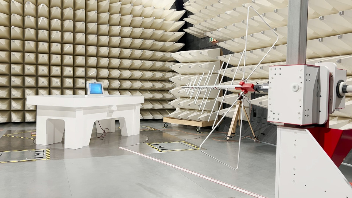 It is full compliant semi-anechoic chamber, characterized up to the frequency of 18GHz, for radiated measurements at the distance of 3m. It is equipped with antennas, radio-frequency amplifiers, a signal generator and an EMI receiver. Such equipment makes it possible to perform radiated emission and radiated immunity tests up to the frequency of 6GHz.