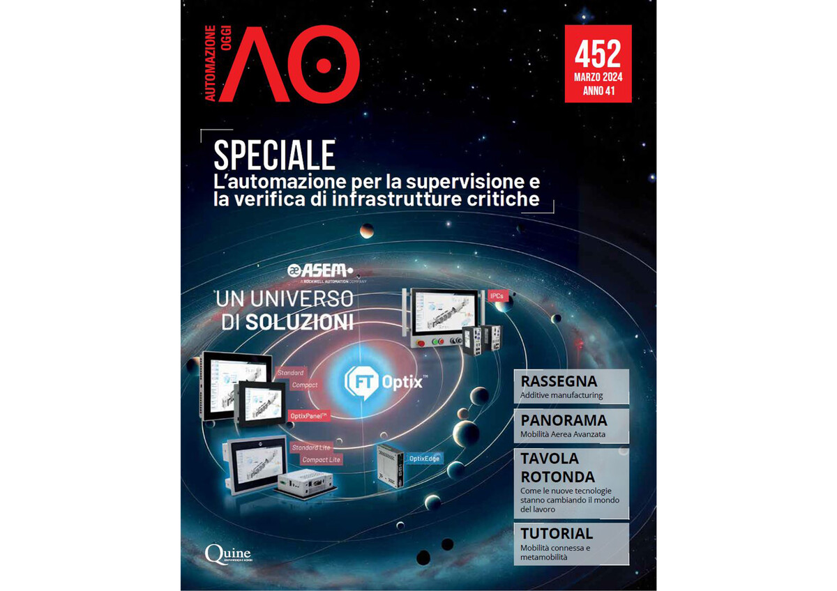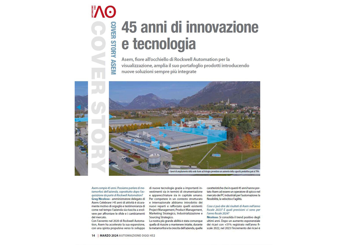 ASEM in "Automazione Oggi" cover, issue 452, March 2024. This year ASEM celebrates its 45th anniversary, and our cover story includes an exclusive 6-page article with in-depth interviews from our team:
